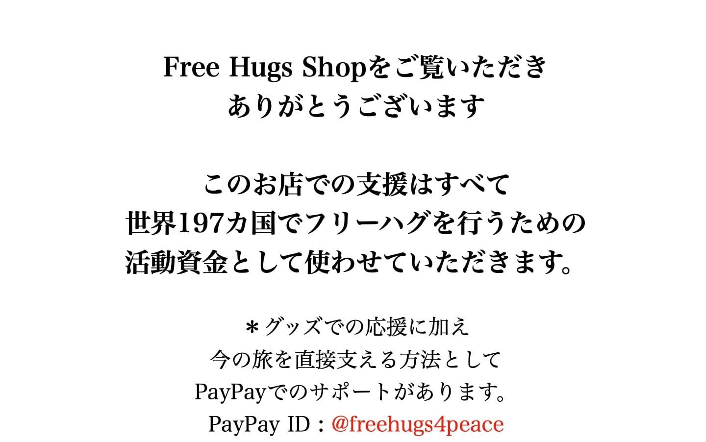 こちらは 世界197カ国でフリーハグを続ける旅を 一緒に支えてくださる方のための応援チケットです。 この1,000円のサポート(1,000ハグ)が 次の一歩を踏み出す力になります。 売上はすべて、フリーハグプロジェクトの活動費に使わせていただきます。 この旅は、仲間の力で続いています。 次の報告も、ぜひ見届けてください。